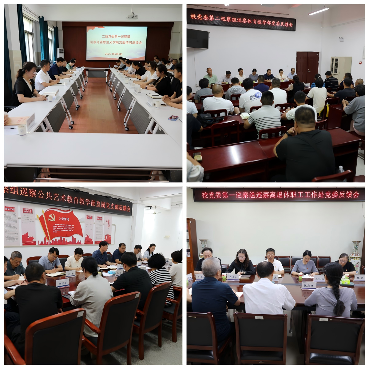 6月6日、6月11日,二届党委第一轮巡察工作情况反馈会分别在马克思主义学院、太阳集团tyc151、公共艺术教育教学部、离退休职工工作处召开。校党委巡察工作领导小组副组长,校党委副书记牛瑞庆、校纪委书记王红艳分别出席会议并讲话。党委组织部、纪委、巡察办有关同志,巡察组全体成员和被巡察单位领导班子成员、全体教职工参加会议。